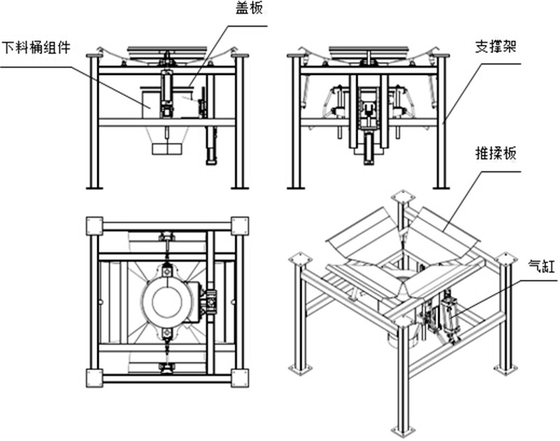 4.物料經料斗落料到其下部的旋轉閥,進入底部管道,工廠來的壓縮氣可將物料氣力輸送至目的地,完成拆包輸送工作(如不需要輸送,此閥門可省去)