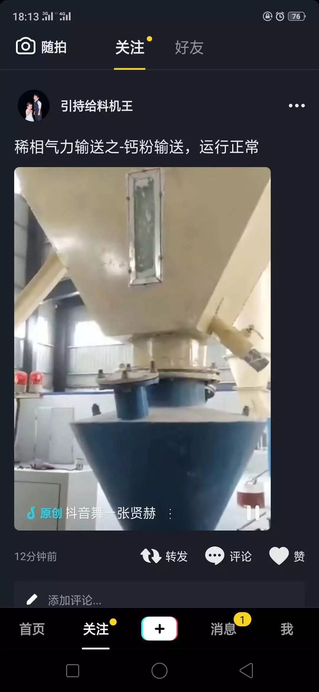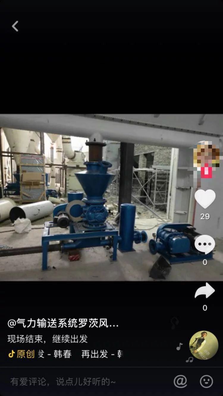 朋友圈配圖確為王經(jīng)理在抖音發(fā)的一個濰坊的客戶反饋回來的視頻,輸送鈣粉的真實案例,運行正常,客戶表示滿意。