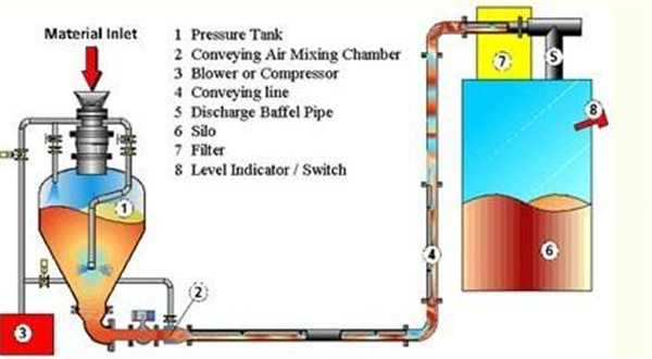 密相泵采用先進的圓頂閥或雙蝶閥卸料,100%充滿密相泵后,圓頂閥球體穿過物料關閉密封;壓縮空氣通過控制閥門進入密相泵,物料按照特定的系統(tǒng)要求使物料以低速的速度進入輸送管道。輸送需要很少的壓縮空氣,實現(xiàn)高的料氣比,保證較低的能耗和非常小的系統(tǒng)磨損。