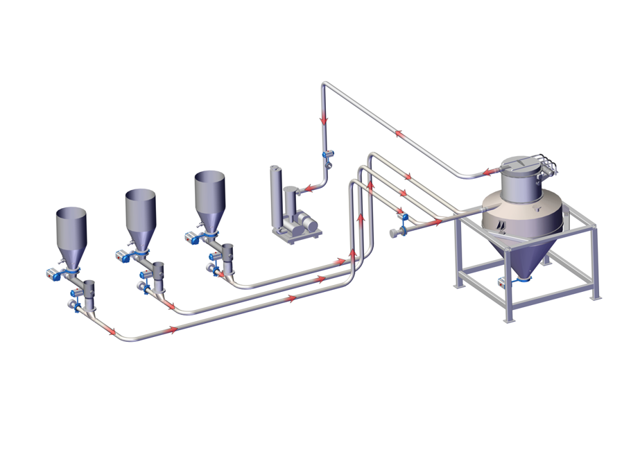 多組份吸料計量稱是結合了負壓吸料與增重式配料的一種新式的動態自動配料系統,該系統的工作原理是多種物料通過各自獨立的定量喂料裝置依次并獨立的通過負壓稀相氣力輸送的形式將物料吸入末端的吸料計量倉內,該吸料計量倉兼具負壓發生及稱重兩個功能。