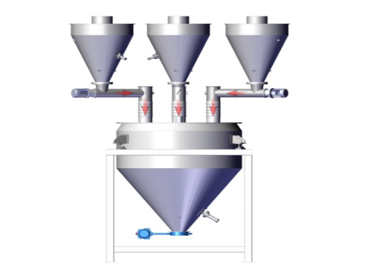 增重式配料系統(tǒng)是把下方的接收料倉作為稱重料倉,其它各獨(dú)立原料料倉通過喂料設(shè)備依次獨(dú)立將物料配料至接收料倉。接收料倉以增加重量的方式自動配料。